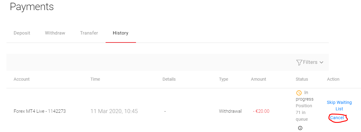 Apabila Anda ingin mengembalikan uang ke akun BDSwiss Anda saat proses penarikan berlangsung, Anda memiliki opsi untuk membatalkan penarikan jika statusnya belum diproses. Hal ini terutama berguna jika penarikan dana akan menyebabkan Anda memiliki dana terbatas dalam akun Anda, sedangkan Anda masih ingin memasang posisi trading tertentu atau menjaga posisi tetap terbuka.